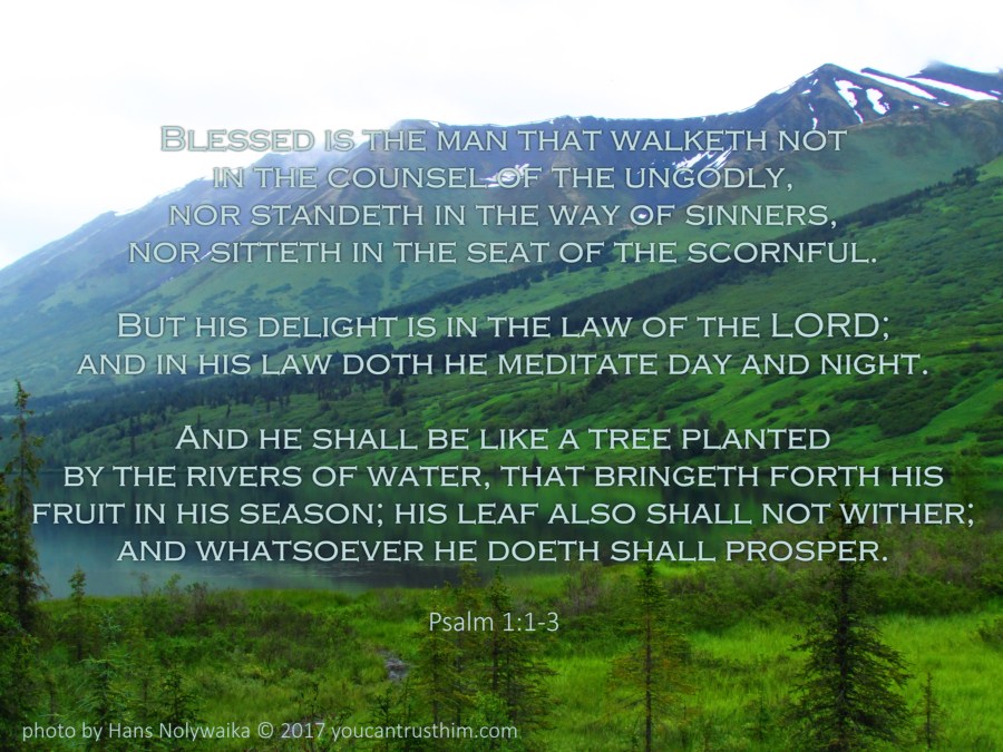 Blessed is the man that walketh not in the counsel of the ungodly, nor standeth in the way of sinners, nor sitteth in the seat of the scornful. But his delight is in the law of the LORD; and in his law doth he meditate day and night. And he shall be like a tree planted by the rivers of water, that bringeth forth his fruit in his season; his leaf also shall not wither; and whatsoever he doeth shall prosper. Psalm 1:1-3