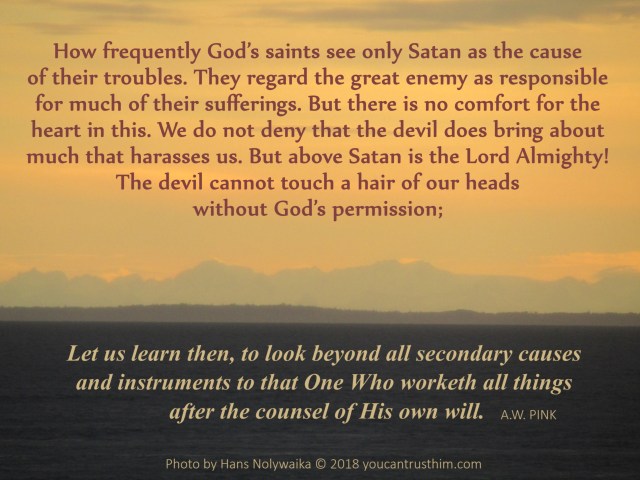 “When he hath tried me.” How frequently God’s saints see only Satan as the cause of their troubles. They regard the great enemy as responsible for much of their sufferings. But there is no comfort for the heart in this. We do not deny that the devil does bring about much that harasses us. But above Satan is the Lord Almighty! The devil cannot touch a hair of our heads without God’s permission; and when he is allowed to disturb and distract us, even then it is only God using him to “try” us. Let us learn then, to look beyond all secondary causes and instruments to that One Who worketh all things after the counsel of His own will (Eph 1:11). This is what Job did. In the opening chapter of the book that bears [Job’s] name, we find Satan obtaining permission to afflict God’s servant.
