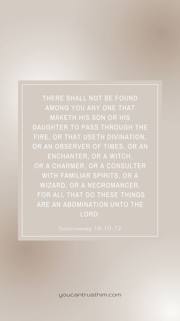 When you enter the land which the Lord your God gives you, you shall not learn to imitate the detestable things of those nations. There shall not be found among you anyone who makes his son or his daughter pass through the fire, one who uses divination, one who practices witchcraft, or one who interprets omens, or a sorcerer, or one who casts a spell, or a medium, or a spiritist, or one who calls up the dead. For whoever does these things is detestable to the LORD; and because of these detestable things the LORD your God will drive them out before you. You shall be blameless before the LORD your God. For those nations, which you shall dispossess, listen to those who practice witchcraft and to diviners, but as for you, the LORD your God has not allowed you to do so. (emphasis added)