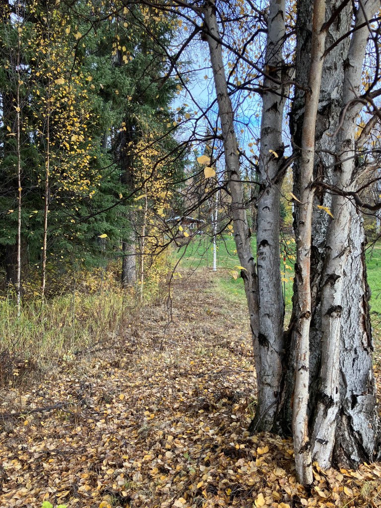 The stunning beauty around me. I love living in the woods. Tall spruce trees, golden birch, the lazy creek outside my window, the profusion of birds that visit our feeders and brighten my days, the flowers I managed to plant this past summer.
