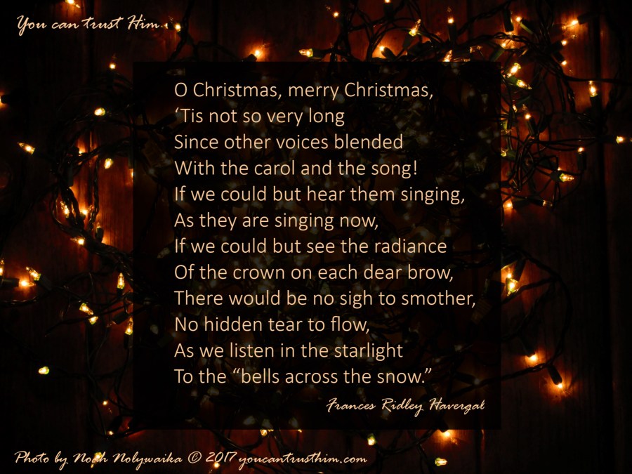 'Bells Across the Snow' Streams in the Desert 12/24 O Christmas, merry Christmas,Is it really come again,With its memories and greetings,With its joy and with its pain!There’s a minor in the carolAnd a shadow in the light,And a spray of cypress twiningWith the holly wreath tonight.And the hush is never brokenBy laughter light and low,As we …