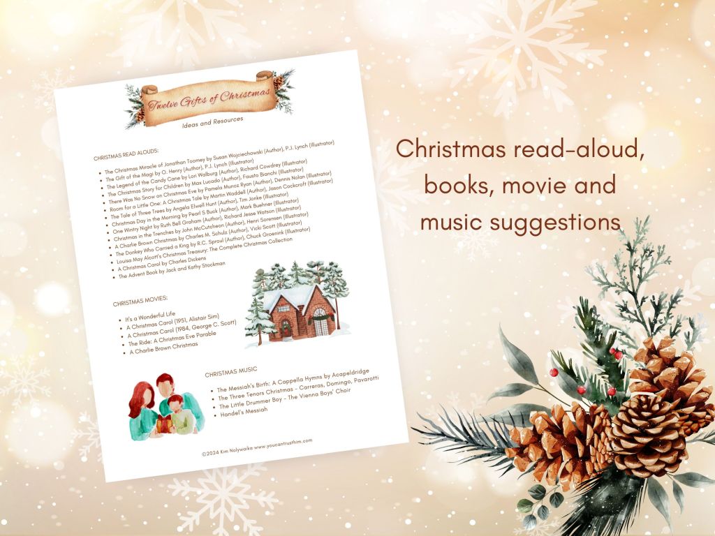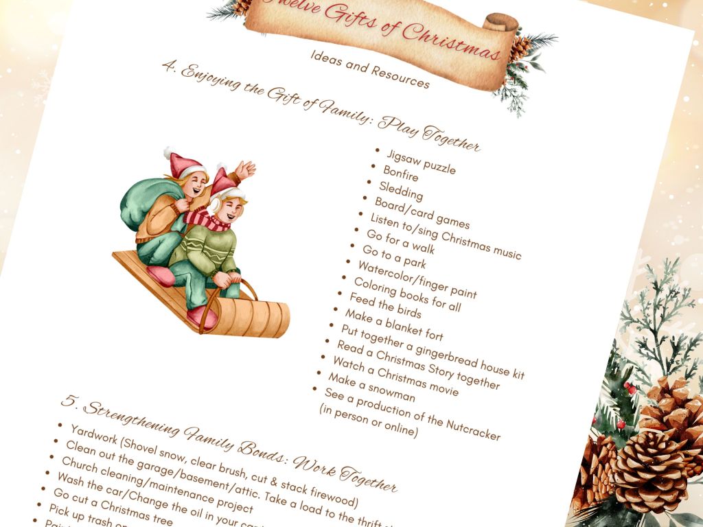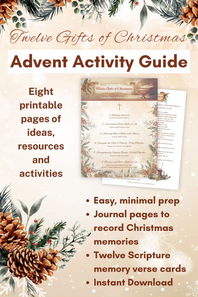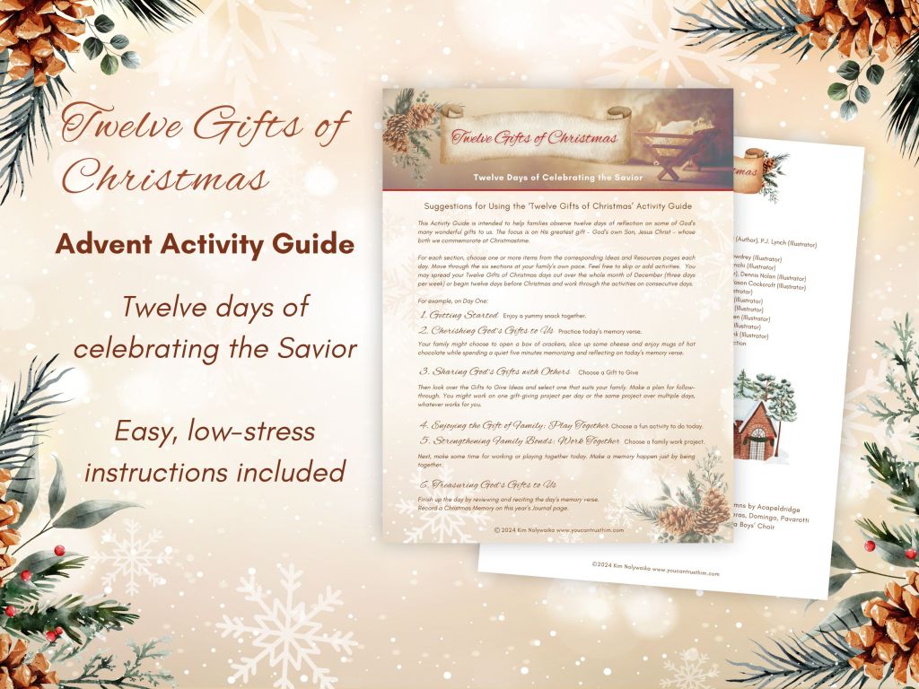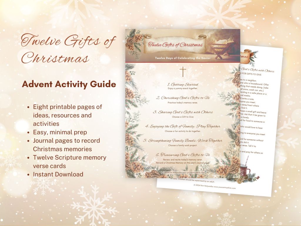 The Twelve Gifts of Christmas Activity Guide is a stress-free, slow-paced way for families to observe twelve days of reflection on some of God’s many wonderful gifts to us. The focus is on His greatest gift – God’s own Son, Jesus Christ – whose birth we commemorate at Christmastime.